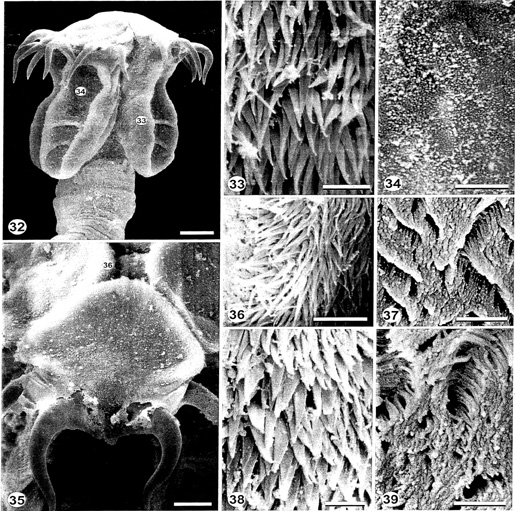 bothridial surface. Bar = 2.5 µm. 34. Microtriches on distal bothridial surface. Bar = 2 µm. 35. Detail of muscular pad showing apical sucker. Bar = 50 µm. 36. Microtriches on proximal surface of muscular pad. Bar = 2 µm. 37. Microtriches on immature segment surface. Bar = 2 µm. 38. Microtriches on cephalic peduncle surface. Bar = 2.5 µm. 39. Microtriches on mature segment surface. Bar = 2.5 µm.