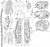 µm. 25. Detail of hooks. Bar = 15 µm. 26. Detail of cocoon. Bar = 25 µm. 27. Cocoon. Bar = 50 µm. 28. Detail of terminal genitalia. Bar =