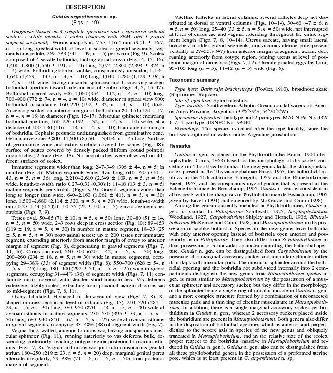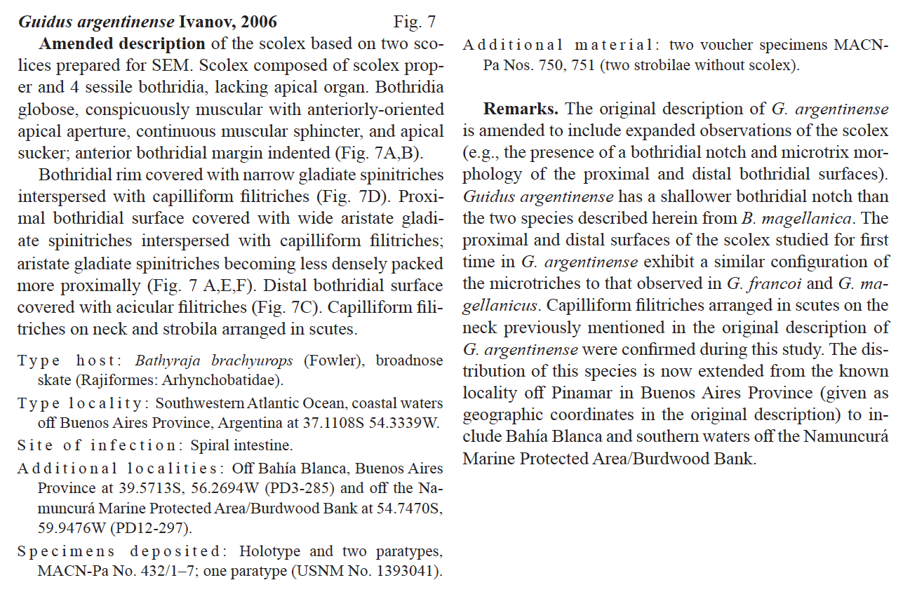 Menoret, A. and V. A. Ivanov. 2021. New species of Guidus Ivanov, 2006 (Cestoda: Phyllobothriidea) from Bathyraja magellanica (Philippi) from the Patagonian Continental Shelf of Argentina. Folia Parasitologica 68: 011.
