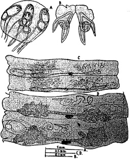Figs. A. Scolex. B. Bothridial hooks. C. Immature segments. D. Mature segment.