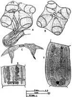 Figs. A. Scolex. B. Scolex (end-on-view). C. Bothridial hooks. D. Immature segment. E. Mature segment.