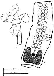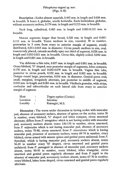 Figs. A-B. Pithophorus trygoni. sp. nov. Figs a. Scolex, B. Mature segment.
