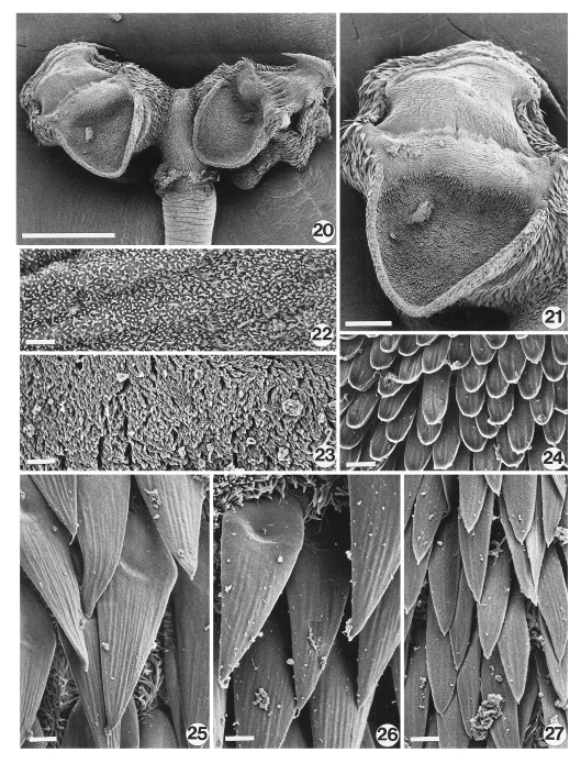 FIGURES 20–27. Scanning electron micrographs of Yorkeria kelleyae n. sp. 20. Scolex; bar = 100 µm. 21. Bothridium; bar = 25 µm. 22. Enlarged view of distal surface of modified anterior region of bothridium; bar = 1 µm. 23. Enlarged view of proglottid; bar = 1 µm. 24. Enlarged view of distal posthook locular surface; bar = 1 µm. 25. Enlarged view of proximal bothridial surface; bar = 1 µm. 26. Enlarged view of pedicel; bar = 1 µm. 27. Enlarged view of cephalic peduncle; bar = 1 µm.