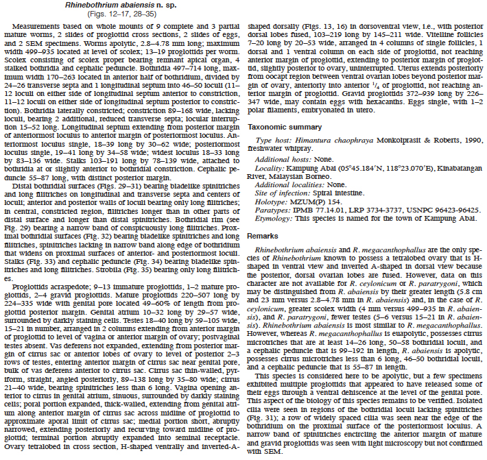 Healy, C. J. 2006. Three new species of Rhinebothrium (Cestoda: Tetraphyllidea) from the freshwater whipray, Himantura chaophraya, in Malaysian Borneo. Journal of Parasitology 92(2): 364-374. (4436) Download PDF |