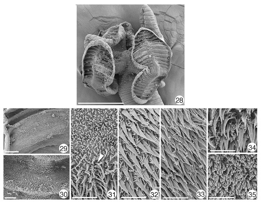 edge. (33) Stalk surface. (34) Cephalic peduncle surface. (35) Proglottid surface. Scale bars: 28, 200 µm; 29, 20 µm; 30, 5 µm; 31–35, 2 µm.