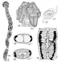 section at level of testes. (16) Proglottid cross section at level of ovary. (17) Egg.