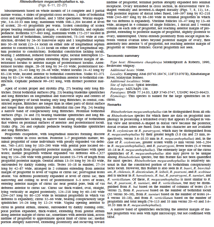 | Total Number of Type Specimens | based on whole mounts of 14 complete and 5 partial mature worms, 4 slides of proglottid cross sections, 1 slide of bothridial cross and longitudinal sections and 3 SEM specimens |
