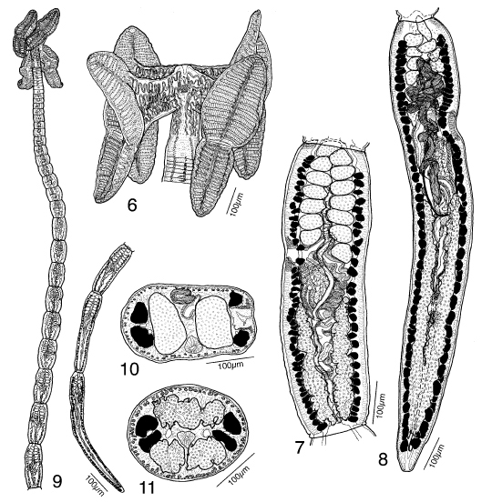 FIGURES 6–11. Rhinebothrium megacanthophallus n. sp. (6) Scolex. (7) Mature proglottid, ventral view. (8) Mature proglottid with expanded vas deferens, dorsal view. (9) Whole worm. (10) Proglottid cross section at level of testes. (11) Proglottid cross section at level of ovary.