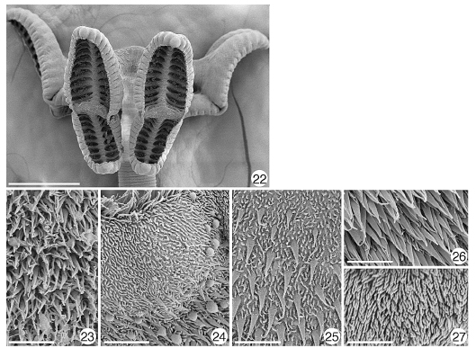 FIGURES 22–27. Rhinebothrium megacanthophallus n. sp. (scanning electron micrographs 22–27). (22) Scolex. (23) Distal bothridial surface. (24) Proximal bothridial surface of posteriormost loculus. (25) Proximal bothridial surface away from bothridial edge. (26) Stalk surface. (27) Proglottid surface. Scale bars: 22, 200 µm; 24, 3 µm; 25–27, 2 µm.