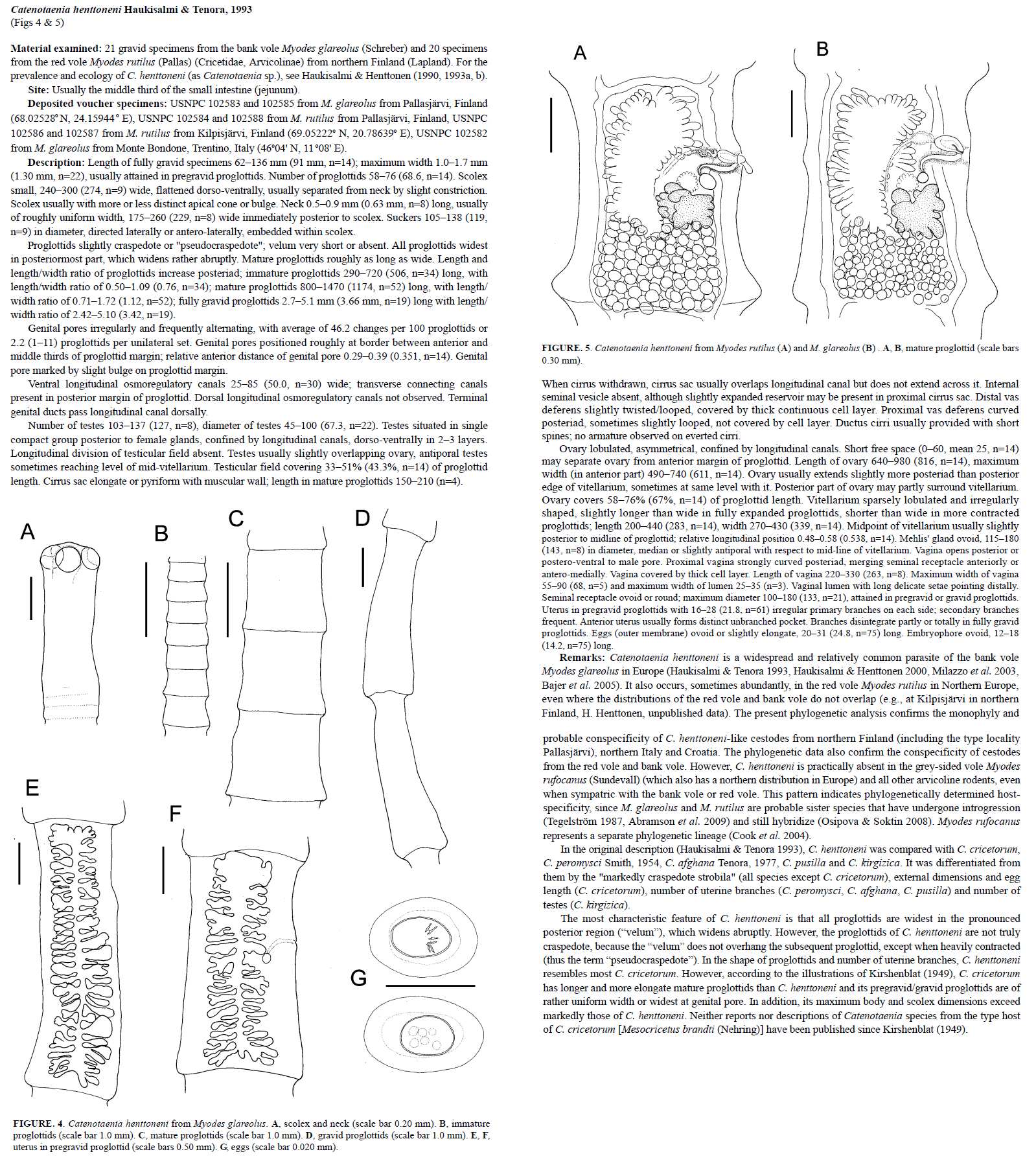 Haukisalmi, V. and F. Tenora. 1993. Catenotaenia henttoneni sp. n. (Cestoda: Catenotaeniidae), a parasite of voles Clethrionomys glareolus and C. rutilus (Rodentia). Folia Parasitologica 40: 29-33. (5150) Download PDF |