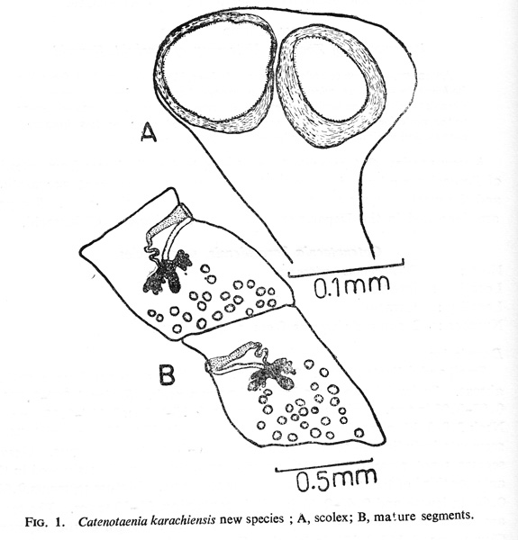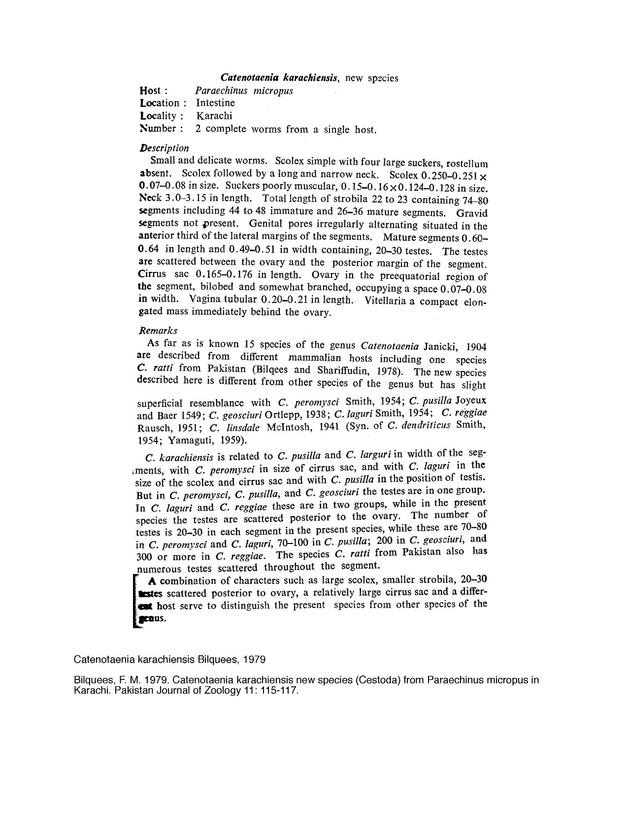 Bilqees, F. M. 1979. Catenotaenia karachiensis, new species (Cestoda) from Paraechinus micropus in Karachi. Pakistan Journal of Zoology 11(1): 115-117.