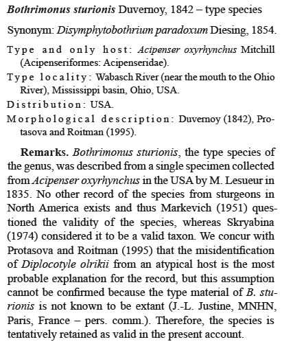 | Scientific Name Notes | Cooper (1918) refers to B. sturionis as the type species for Bothrimonus. Kuchta et al. (2014) kept the species as valid, even though its validity is questionable (no other records since the original one; misidentification with Diplocotyle olrikii cannot be ruled out.. |