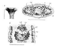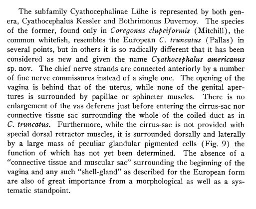 Fig. 7.-Cyathocephalus americanus, scolex, toto. Fig. 8.-Cyathocephalus americanus, transection through ovarian isthmus. Fig. 9.-Cyathocephalus americanus, frontal section of ripe proglottis.