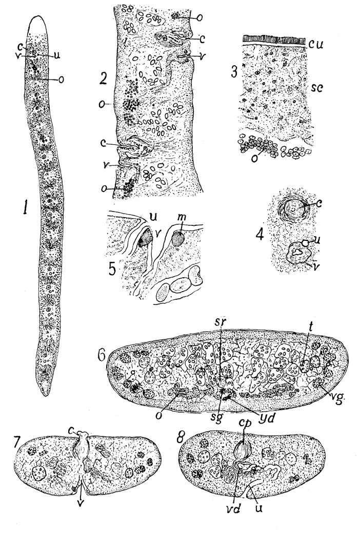 Fig. 1. Sketch of specimen mounted in balsam, somewhat diagrammatic. In this specimen there were 12 sets of reproductive apertures on one side and 8 on the other. Length 16 mm. Fig. 2. Sagittal section near median line showing reproductive apertures on opposite sides of the strobile. The succeeding section to this in the series shows the uterus in about the same relative position as that of the vagina in the lower left of the sketch. Thickness of strobile at this point 0.30 mm. Fig. 3. Cuticle and subcuticula highly magnified. Thickness of cuticle 0.01 mm. Fig. 4. Reproductive apertures as seen in horizontal section. Sketch made from section showing first appearance of the uterus. The vagina had appeared first in the preceding section, and the cirrus in the sixth preceding section. Diameter of cirrus bulb 0.24 mm. Fig. 5. External apertures of vagina and uterus, transverse section. Long diameter of ovum 0.035 mm. Fig. 6. Transverse section showing uterus with ova, etc. Breadth of strobile at this point. 1.5 mm. Fig. 7. Transverse section showing exceptional arrangement of genital pores, the cirrus opening on one side and the vagina on the other. Longer diameter of section 0.98 mm. Fig. 8. From same series of sections as Fig. 7, two sections intervening between 7 and 8. The cirrus bulb still shows and the vagina is replaced by the uterus.