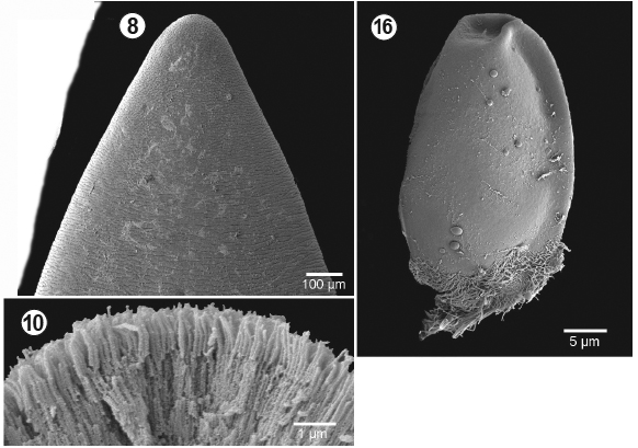 view (1, 2, 7) and dorsoventral (6, 8). Surface of the scolex covered with capilliform filitriches, magnification 10 000× (3–5, 9, 10).