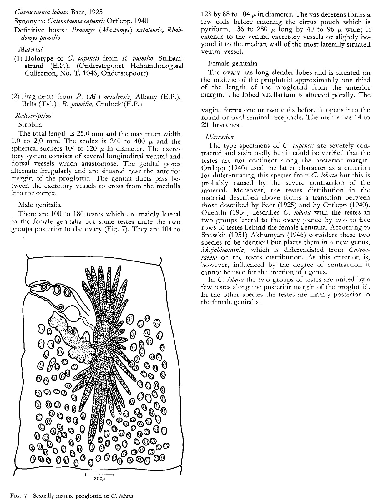 Baer, J. G. 1925. Sur quelques cestodes du Congo belge. Revue Suisse de Zoologie 32: 239-251. (5155) Download PDFHaukisalmi, V., A. Ribas, K. Junker, A. Spickett, S. Matthee, H. Henttonen, J. Jrijer, A. Halajian, J. L. Anders, and M. Nakao. 2018. Molecular systematics and evolutionary history of catenotaeniid cestodes (Cyclophyllidea). Zoologica Scripta 47: 221-230. (7061) Download PDF |