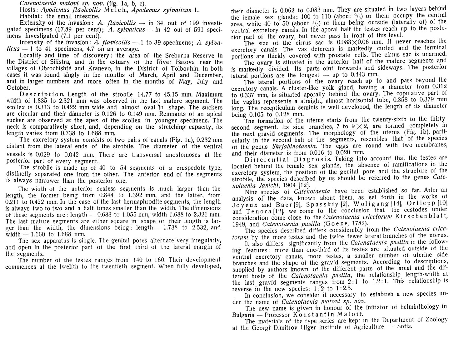 Genov, T. 1971. A new cestode from rodents in Bulgaria - Catenotaenia matovi sp. nov. (Cestoidea, Catenotaeniidae). Comptes Rendus de l Academie des Sciences Agricoles en Bulgarie 4: 119-122. (5156) Download PDFHaukisalmi, V., A. Ribas, K. Junker, A. Spickett, S. Matthee, H. Henttonen, J. Jrijer, A. Halajian, J. L. Anders, and M. Nakao. 2018. Molecular systematics and evolutionary history of catenotaeniid cestodes (Cyclophyllidea). Zoologica Scripta 47: 221-230. (7061) Download PDF |