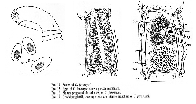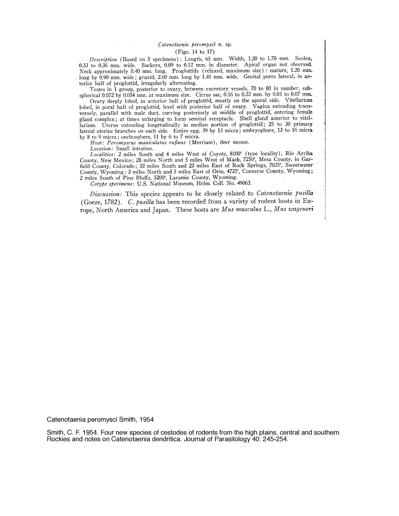 Smith, C. F. 1954. Four new species of cestodes of rodents from the high plains, central and southern Rockies and notes on Catenotaenia dendritica. Journal of Parasitology 40(3): 245-254. (2964) Download PDF |