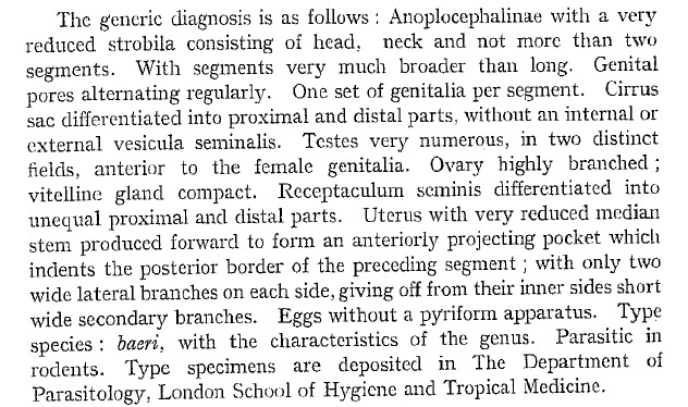 Lynsdale, J. A. 1953. On a remarkable new cestode, Meggittina baeri gen. et sp. nov. (Anoplocephalinae) from rodents in Southern Rhodesia. Journal of Helminthology 27: 129-142.
