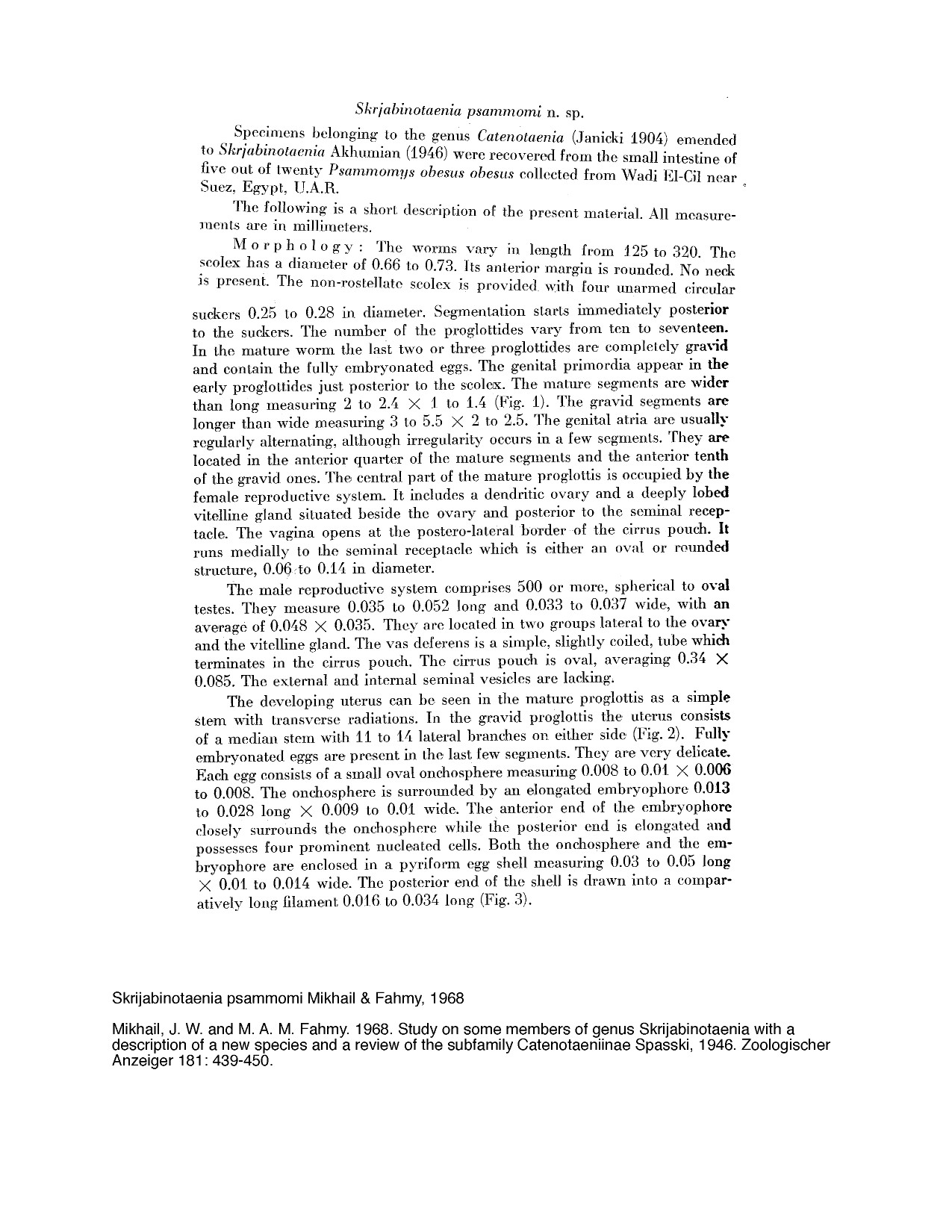 Mikhail, J. W. and M. A. M. Fahmy. 1968. Study on some members of genus Skrjabinotaenia with a description of a new species and a review of the subfamily Catenotaeniinae Spasski, 1946. Zoologischer Anzeiger 181: 439-450. (5169) Download PDF |