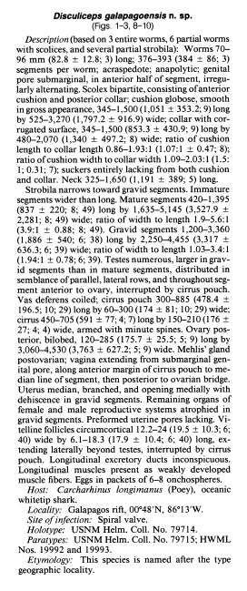 Nock, A. M. and J. N. Caira. 1988. Disculiceps galapagoensis n. sp. (Lecanicephalidea: Disculicepitidae) from the shark, Carcharhinus longimanus, with comments on D. pileatus. Journal of Parasitology 74(1): 153-158. (334) Download PDF |