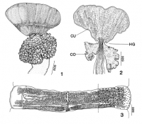 FIGURES 1-3. Disculiceps galapagoensis n. sp. 1. Whole mount of scolex. 2. Longitudinal section through scolex. 3. Whole mount of mature segment. Vitellaria are circumcortical throughout the segment, but are illustrated only to the viewer’s right of the dashed line.