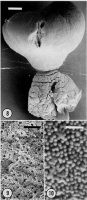 FIGURES 8-10. Scanning electron micrographs of Disculiceps galapagoenesis n. sp. 8. Entire scolex (cushion is damaged slightly). Scale bar = 200µm. 9. Magnified view of cushion. Scale bar = 5µm. 10. Magnified view of collar. Scale bar = 0.5µm.