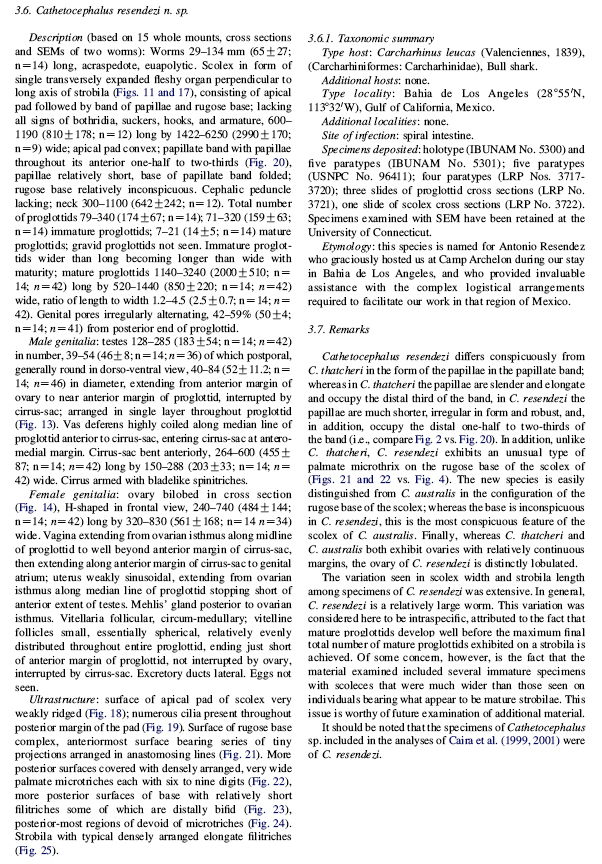 | Type Material | IBUNAM No. 5300(holotype) IBUNAM No. 5301 (5 paratypes) USNPC No. 96411 (5 paratypes LRP Nos. 3717-3720 (5 paratypes); 3721 (3 slides of cross sections of paratypes); 3722 (1 slide of scolex cross sections) |