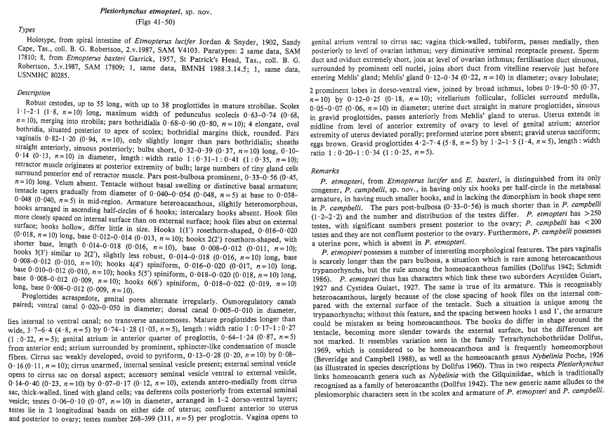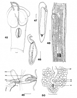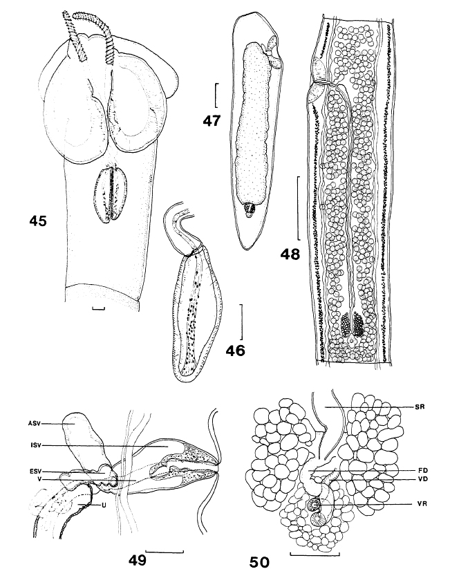 Figs 45-50. Plesiorhynchus etmopteri, gen. et sp. nov.: 45, scolex; 46, bulb; 47, gravid proglottis; 48, mature proglottis; 49, cirrus sac and seminal vesicles, dorsal view; 50, female genital complex... MoreFigs 45-50. Plesiorhynchus etmopteri, gen. et sp. nov.: 45, scolex; 46, bulb; 47, gravid proglottis; 48, mature proglottis; 49, cirrus sac and seminal vesicles, dorsal view; 50, female genital complex, dorsal view. Scale lines: 45, 46, 49, 50, 0.1mm. Abbreviations as for Figs 21-28; VD, vitelline duct. Abbreviations: ASV, accessory seminal vesicle; DOC, dorsal osmoregulatory canal; ESV, external seminal vesicle; FD, fertilisation duct; ISV, internal seminal vesicle; O, ovary; OI, ovarian isthmus; SR, seminal receptacle; T, testis; U, uterus; V, vagina; VC, vitelline canal; VOC, ventral osmoregulatory canal; VR, vitelline reservoir. |