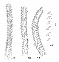 Figs 41-44. Plesiorhynchus etmopteri, gen. et sp. nov., tentacular armture: 41, internal surface, basal and metabasal region (dotted line shows division between hooks 1 and 1'); 42, external surface, ... MoreFigs 41-44. Plesiorhynchus etmopteri, gen. et sp. nov., tentacular armture: 41, internal surface, basal and metabasal region (dotted line shows division between hooks 1 and 1'); 42, external surface, basal and metabasal regions (dotted line shows division between hooks 6 and 6'); 43, bothridial surface, basal and metabasal regions; 44, profiles of hooks 1-6. Scale lines: 41-43, 0.025mm; 44, 0.01mm. |