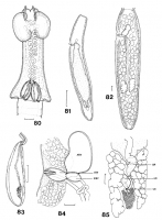 Figs 80-85. Deanicola minor, gen. et sp. nov.: 80, scolex; 81, gravid proglottis; 82, mature proglottis; 83, bulb; 84, male genital ducts; 85, female genital complex. Scale lines: 80, 82-85, 0.1mm. 81... MoreFigs 80-85. Deanicola minor, gen. et sp. nov.: 80, scolex; 81, gravid proglottis; 82, mature proglottis; 83, bulb; 84, male genital ducts; 85, female genital complex. Scale lines: 80, 82-85, 0.1mm. 81, 1.0mm. Abbreviations as for Figs 21-28; UD, uterine duct. Abbreviations: ASV, accessory seminal vesicle; DOC, dorsal osmoregulatory canal; ESV, external seminal vesicle; FD, fertilisation duct; ISV, internal seminal vesicle; O, ovary; OI, ovarian isthmus; SR, seminal receptacle; T, testis; U, uterus; V, vagina; VC, vitelline canal; VOC, ventral osmoregulatory canal; VR, vitelline reservoir. |