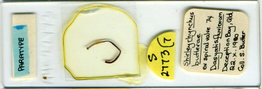 | Scientific Name Notes | This species was first allocated tentatively to the Gilquiniidae by Beveridge & Campbell (1988) and then to the Shirleyrhynchidae by Campbell & Beveridge (1994). When Beveridge & Campbell (1998) moved Tetrarhynchus aetobatidis Shipley & Hornell, 1906 to the genus Shirleyrhynchus as Shirleyrhynchus aetobatidis (Shipley & Hornell, 1906) Beveridge & Campbell, 1998, they synonymized S. aetobatidis and Shirleyrhynchus butlerae Beveridge & Campbell, 1988, briefly making S. butlerae and junior synonym of S. aetobatidis. However, Schaeffner (2016) resurrected S. butlerae from synonomy. |