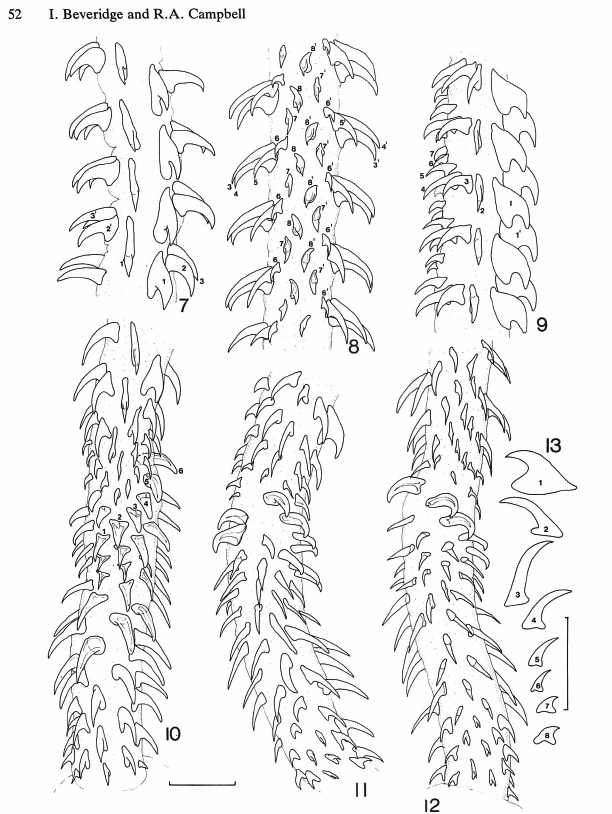 Figs 7-13. Shirleyhynchus butlerae n.g., n. sp. Tentacular armature. 7. Metabasal region, internal surface; bothridial surface on right hand side. 8. Metabasal region, external surface; bothridial surface on left hand side. 9. Metabasal region, bothridial surface. 10. Basal region, internal surface; bothridial surface on right hand side. 11. Basal region, antibothridial surface, internal surface on right hand side. 12. Basal region, external surface. 13. Metabasal hooks 1-8 in profile. Scale lines 0.1 mm.