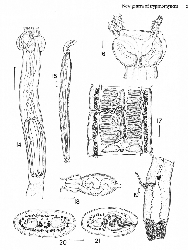 osmoregulatory canals. 21. Transverse section through cirrus sac. Scale lines: Fig. 14, 1.0 mm; Figs 15-21, 0.1mm.