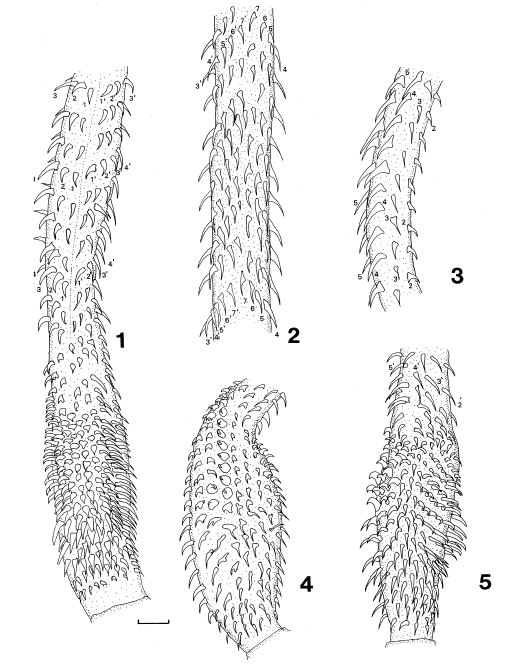 surface. Dotted line indicates very slight separation between hook files 1 and 1´. 2. Metabasal region, 25 hook rows beyond basal swelling, bothridial surface. 3. Metabasal region, 12 hook rows beyond basal swelling, internal surface. 4. Basal swelling, bothridial surface. 5. Basal swelling, external surface. Scale-bar: 10 μm.
