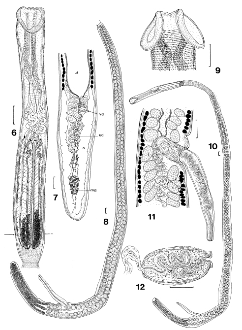 bothridia. 10. Entire worm. 11. Region of genital atrium with everted cirrus. 12. Cirrus-sac. Abbreviations: mg, Mehlis’ gland; o, ovary; t,