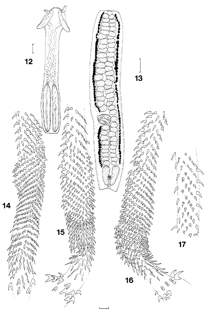 Figs 12-17. Eutetrarhynchus bareldsi, sp. nov. 12, scolex; 13 mature proglottis; 14, basal armature, external surface; 15, basal armature, internal surface; 16, basal armature, bothridial surface; 17, metabasal armature. Scale lines: Figs 12, 13, 0.1 mm; Figs 14-17, 0.01 mm.