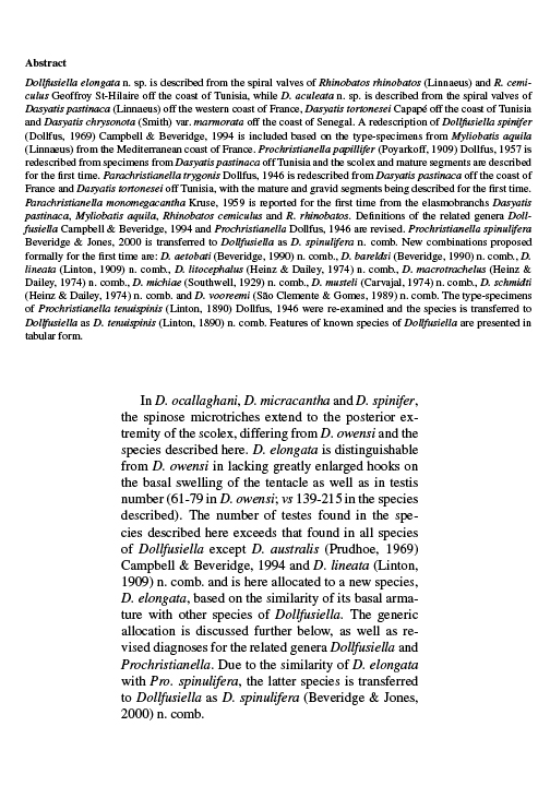 Linton, E. 1908. IX. Helminth fauna of the Dry Tortugas. I. Cestodes. Publication No. 102, Papers from the Tortugas Laboratory of the Carnegie Institution of Washington 1: 157-190. (277) Download PDFBeveridge, I., L. Neifar, and L. Euzet. 2004. Eutetrarhynchid cestodes from Atlantic and Mediterranean elasmobranch fishes, with the description of two new species of Dollfusiella Campbell & Beveridge, 1994 and redescriptions of Prochristianella papillifer (Poyarkoff, 1909) Dollfus, 1957 and Parachristianella trygonis Dollfus, 1946. Systematic Parasitology 59: 81-102. (4254) Download PDF |