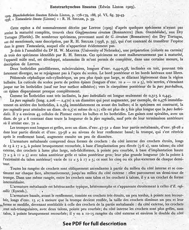 Redescription from Dollfus (1942) (As "Eutetrarhynchus lineatus [Linton, 1909] Dollfus, 1942"), Cit#140.