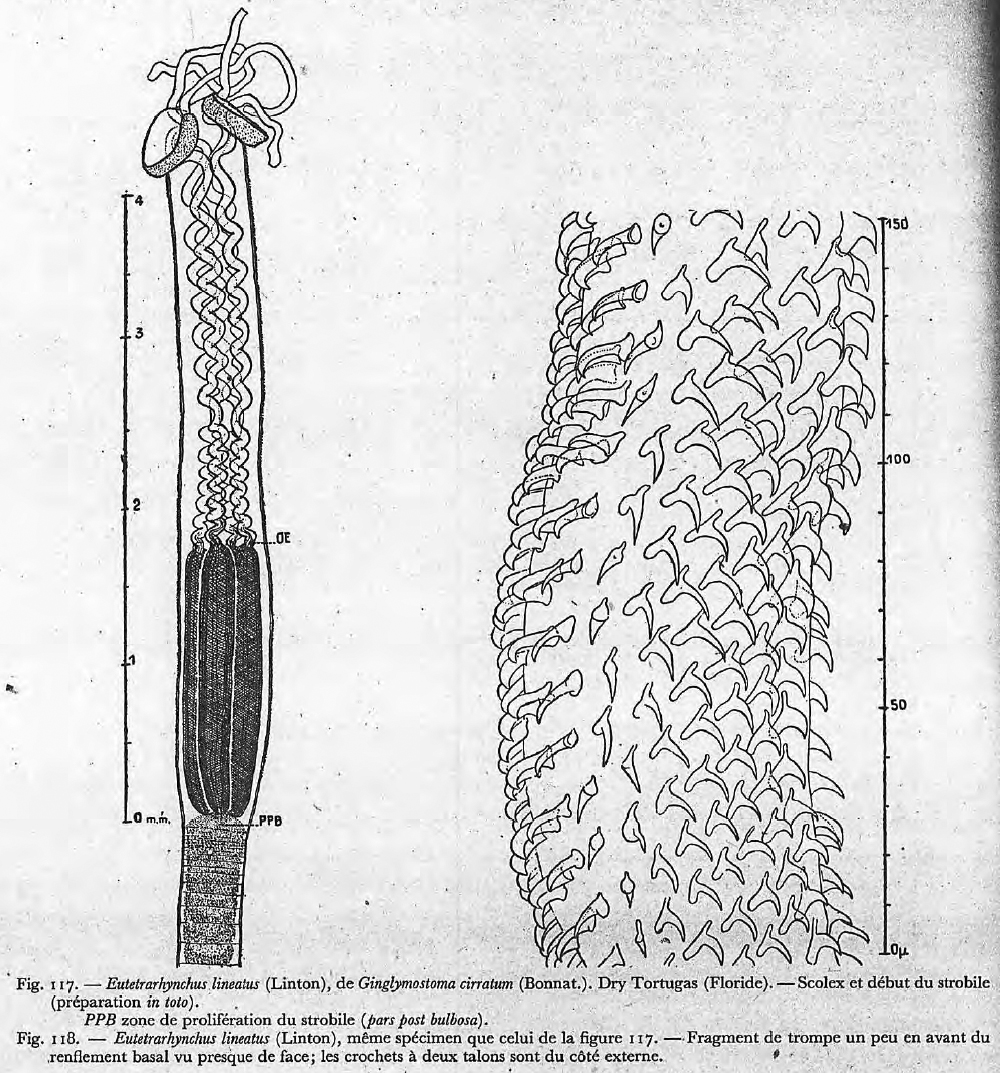 Redescription from Dollfus (1942) (As "Eutetrarhynchus lineatus [Linton, 1909] Dollfus, 1942"). Fig. 117. — Eutetrarhynchus lineatus (Linton), de Ginglymostoma cirratum (Bonnat.). Dry Tortugas (Floride). — Scolex et debut du strobile