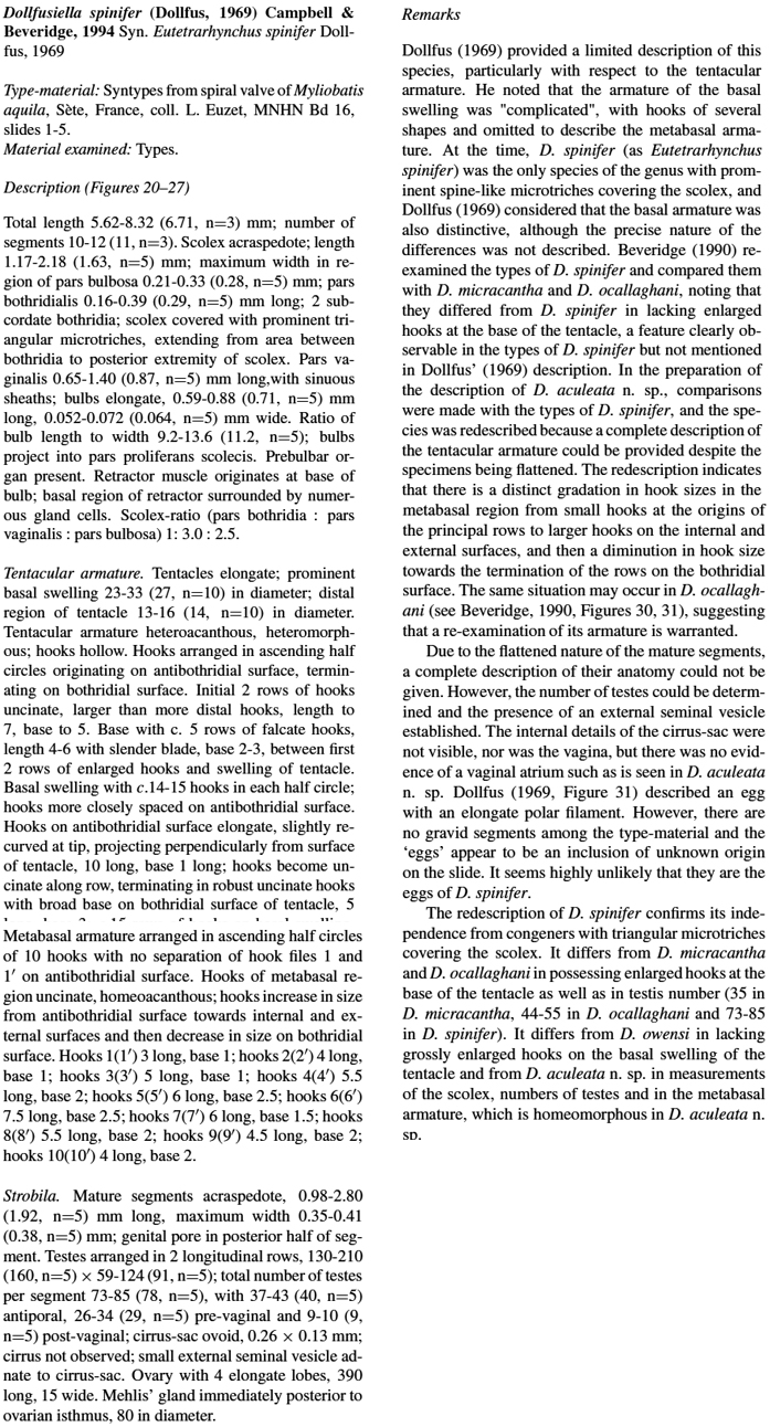 | Scientific Name Notes | Original description on page 503 of Dollfus (1969). It appears that Beveridge and Jones (2000) were the first to use this combination although it is not designated as such; in fact, for several species of Dollfusiella these authors erroneously (?) attribute the new combination to Campbell and Beveridge (1994) (note: in Campbell and Beveridge [1994] only E. carayoni and E. australis were transferred to Dollfusiella). |