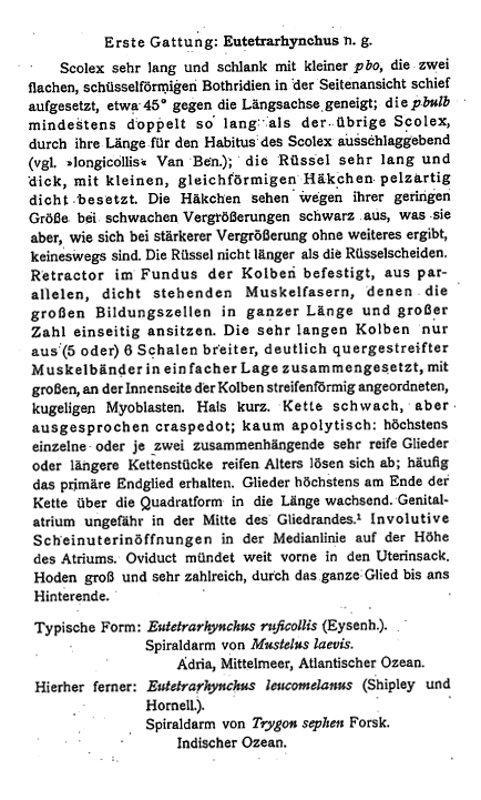Shipley, A. E. and J. Hornell. 1906. Report on the cestode and nematode parasites from the marine fishes of Ceylon. Report to the Government of Ceylon on the Pearl Oyster Fisheries of the Gulf of Manaar (Herdman), Part 5 5: 43-96. (431) Download PDFPintner, T. 1913. Vorarbeiten zu einer Monographie der Tetrarhynchoideen. Sitzunzberichten der Akademie der Wissenschaften in Wien. Mathematik-Naturwissenschaften Classe 122: 171-253. (4384) Download PDF |