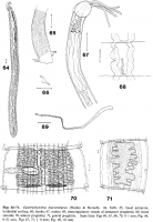Figs 64-71. Eutetrarhynchus leucomelanus (Shipley & Hornell). 64, bulb; 65, basal armature, bothridial surface; 66, hooks; 67, scolex; 68, osmoregulatory system of immature proglottis; 69, entire cestode; 70, mature proglottis; 71, gravid proglottis. Scale lines: Figs 64, 65, 68, 70, 0.1 mm; Fig. 66, 0.01 mm; Figs 67, 71, 1.0 mm; Fig. 69, 10 mm.