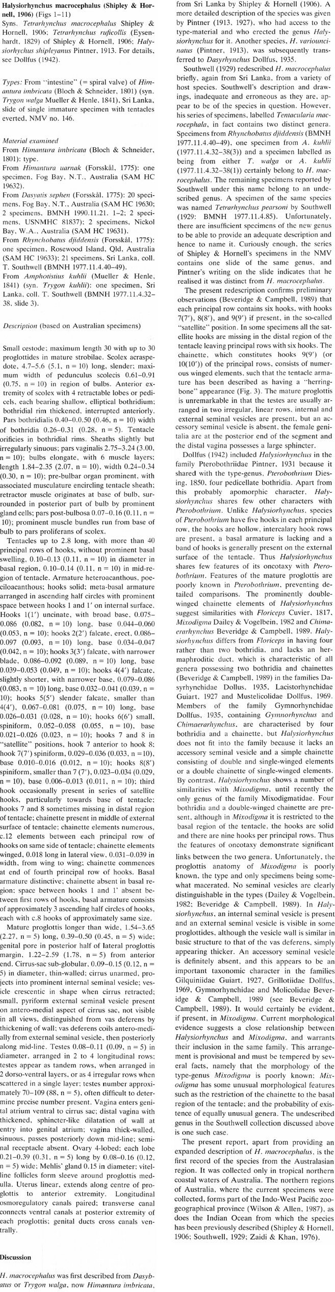 | Synonyms | Tetrarhynchus macrocephalus Shipley & Hornell, 1906; Halsiorhynchus shipleyanus Pintner, 1913 |