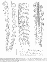 Fig5 1-4. Halysiorhynchus macrocephalus (Shipley & Hornell. 1906). 1-3 Basal and metabasal regions of tentacle. 1. Internal surface. 2. Bothridial surface, external surface on left. 3. External surface, note chainette. 4. Profiles of principal hooks l(l') to 6(6'), satellite hooks 7(7') to 8(8') and double-winged chainette elements (c) in frontal and profile views. Scale-bars: 0.1 mm (Figs 1-3 to same scale). Specimens from Dasyatis sephen.