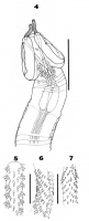 Bars equal 0.05 mm unless otherwise indicated. 4. Mecistobothrium myliobati gen. et sp. n. Scolex (bar=0.5). 5. Hook arrangement at distal end of tentacle. 6. Metabasal hooks. 7. Basal hooks.