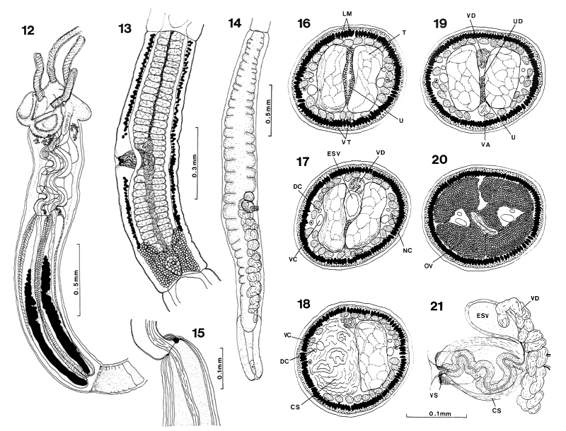 Figs. 12-15. Oncomegas wageneri (Linton, 1890). 12. Scolex. 13. Mature segment. 14. Gravid segment. 15. Anterior portion of bulb, showing prebulbar organ. Figs 16-21. Oncomegas wageneri (Linton, 1890)... MoreFigs. 12-15. Oncomegas wageneri (Linton, 1890). 12. Scolex. 13. Mature segment. 14. Gravid segment. 15. Anterior portion of bulb, showing prebulbar organ. Figs 16-21. Oncomegas wageneri (Linton, 1890). 16-20. Transverse sections of mature segment; 16. Anterior to cirrus-sac. 17. Through external seminal vesicle. 18. Through cirrus-sac; note dorsal position of osmoregulatory canals. 19. Posterior to cirrus-sac; note vagina and uterine duct. 20. Through ovarian isthmus, note tetra-loned ovary and osmoregulatory ducts between lobes. 21. Wholemount dorsal view of cirrus sac, external seminal vesicle, and distal vagina. Abbreviations: CS, cirrus-sac; DC, dorsal osmoregulatory canal; ESV, external seminal vesicle; LM, longitudinal muscle bundles; NC, lateral nerve cord; OV, ovary; T, testis; U, uterus; UD, uterine duct; VA, vagina; VC, ventral osmoregulatory canal; VD, vas deferens; VS, vaginal sphincter; VT, vitelline follicle. |