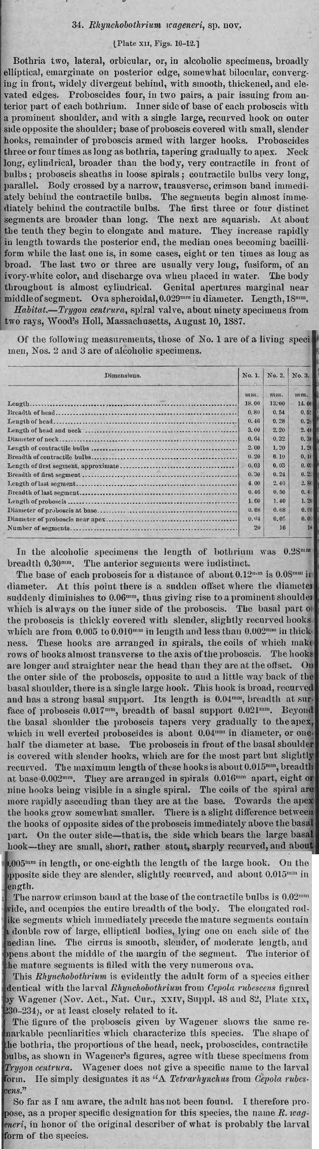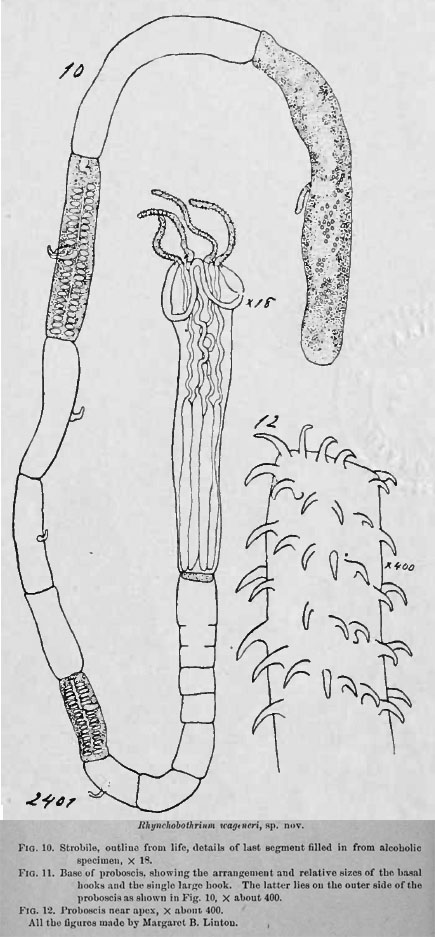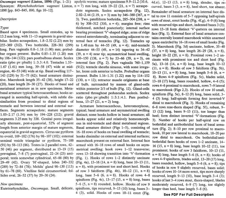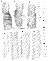 Figs 1-11. Oncomegas wageneri (Linton, 1890), tentacular armature. 1. Basal armature and proximal metabasal region of tentacle, internal face. 2. Basal armature, antibothridial face. 3. Basal armature... MoreFigs 1-11. Oncomegas wageneri (Linton, 1890), tentacular armature. 1. Basal armature and proximal metabasal region of tentacle, internal face. 2. Basal armature, antibothridial face. 3. Basal armature and proximal metabasal region of tentacle, external face. 4(a-g). Basal armature hook types, proximal to distal, along one file on internal face. 5(a-f). Basal armature, hook types, proximal to distal, along one file on external face. 6. Proximal metabasal region, internal face. 7. Mid-tentacle region, internal face. 8. Proximal metabasal region, antibothridial face, internal face at left. 9. Antibothridial surface in distal region of tentacle, internal face on left. 10(a-d) Metabasal armature, hook types from one file of internal face, lower metabasal region to tip of tentacle. 11(a-d) Metabasal hooks from one file on external face, lower metabasal region to tip of tentacle. |