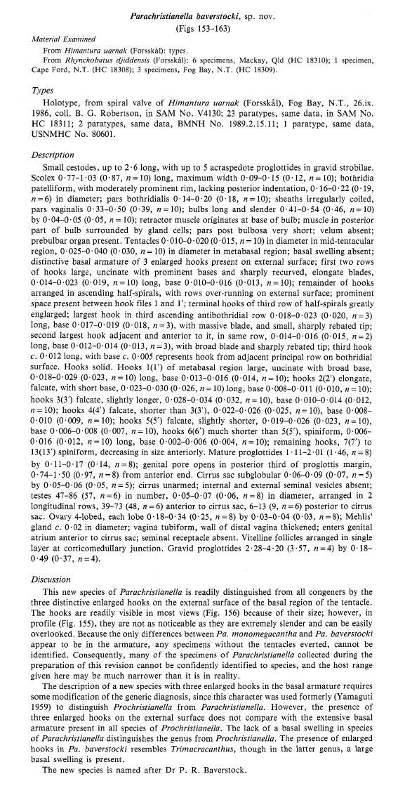 Figs 158-163. Parachristianella baverstocki, sp. nov. 158, 159, scoleces; 160, mature proglottis;