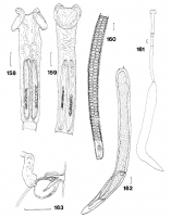 161, entire cestode; 162, gravid proglottis; 163, cirrus sac and distal vagina. Scale lines: 0.1 rnm.
